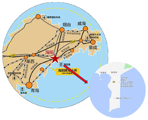区位:坐落于山东海阳,位于胶东半岛的重要交通枢纽,紧邻青岛。周边生态环境优越,旅游资源丰富,自然资源丰富。