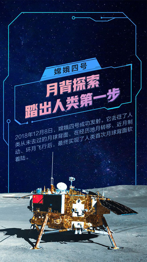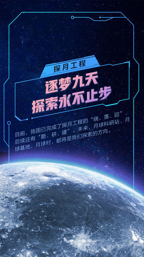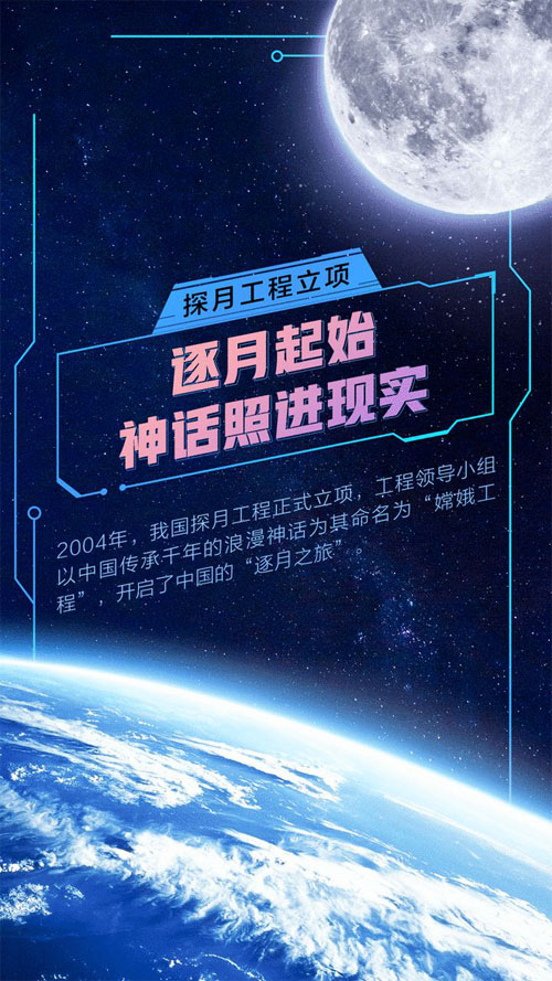 2004年,中国正式开展月球探测工程,并命名为“嫦娥工程”。嫦娥工程分为“无人月球探测”“载人登月”和“建立月球基地”三个阶段。 2007年10月24日18时05分,“嫦娥一号”成功发射升空,在圆满完成各项使命后,于2009年按预定计划受控撞月。2010年10月1日18时59 分57秒“嫦娥二号”顺利发射,也已圆满并超额完成各项既定任务。2012年9月19日,探月工程已经完成嫦娥三号卫星和玉兔号月球车 的月面勘测任务。嫦娥四号是嫦娥三号的备份星。嫦娥五号主要科学目标包括对着陆区的现场调查和分析,以及月球样品返回地球以 后的分析与研究。中国人的探月工程,为人类和平使用月球作出了新的贡献。