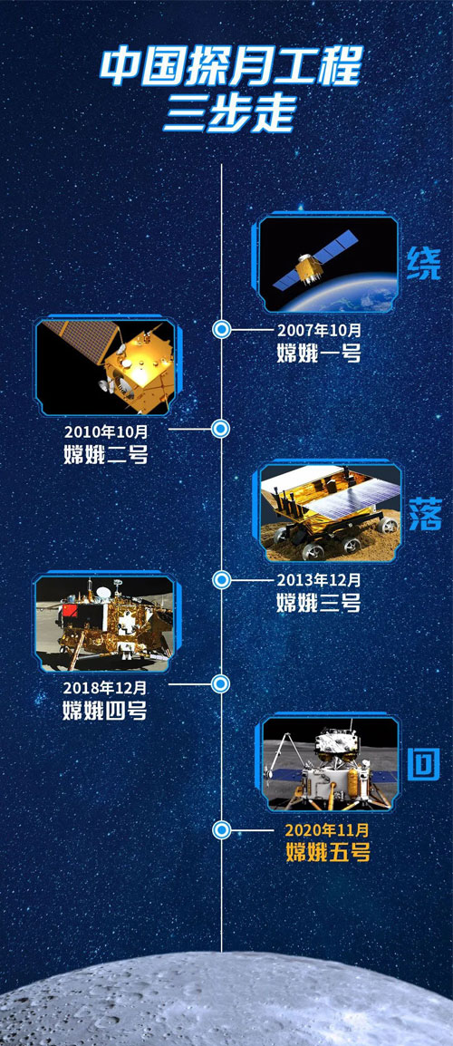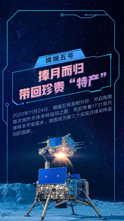 2020年11月24日,中国在中国文昌航天发射场,用长征五号遥五运载火箭成功发射探月工程嫦娥五号探测器,火箭飞行约2200秒后, 顺利将探测器送入预定轨道,开启中国首次地外天体采样返回之旅。12月1日,嫦娥五号探测器成功在月球正面预选着陆区着陆。12月 17日,嫦娥五号返回器携带月球样品,采用半弹道跳跃方式再入返回,在内蒙古四子王旗预定区域安全着陆。